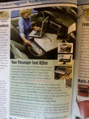 1) A person who’s GPS, iPOD, cell phone, are just not enough accoutrement to their driving experience. They now need a filing system, computer, and printer. I thought this is what offices were invented for. That and looking up articles on silly gadgets sold by Sky Mall.